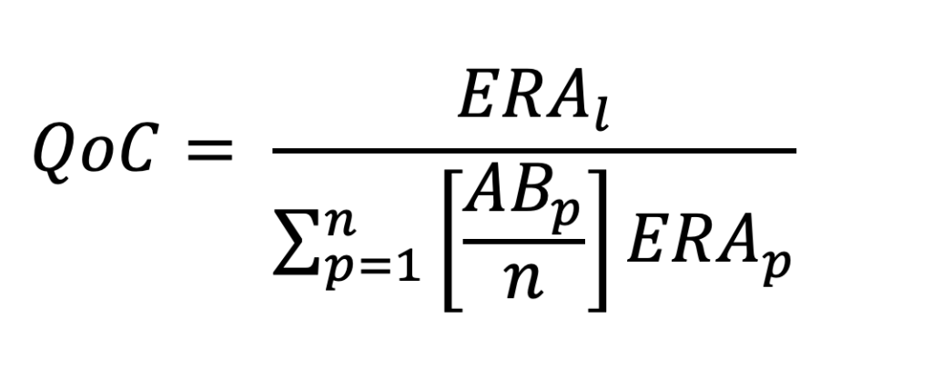 Where, QoC is Quality of Competition, ERAl is the league-average earned runs average (ERA), n is the number of pitchers a batter faced in a given season, p is an individual pitcher, ABp is the number of at-bats taken by a batter for a given pitcher p over the course of the season, and ERAp is the season-average ERA of the specific pitcher .