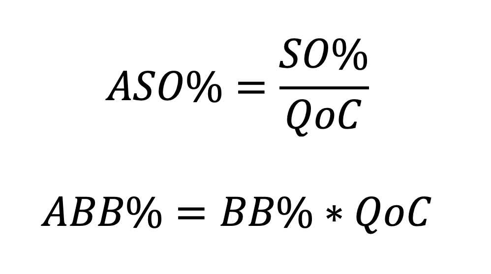When adjusted, ASO% and ABB% will demonstrate SO% and BB% that are scaled based on the caliber of pitchers faced in a season. The SO% is divided by the QoC to calculate ASO% as a lower SO% indicates better performance against higher caliber pitchers. Conversely, the BB% is multiplied by the QoC to calculate ABB% as a higher BB% indicates better performance against higher caliber pitchers.