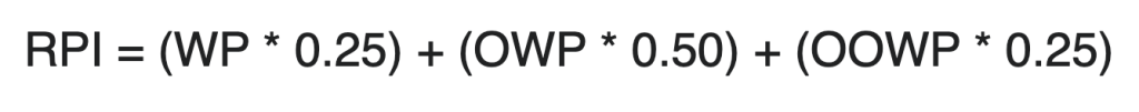 Where, WP is the team’s winning percentage (number of games won/number of games played), OWP is the mean winning percentage of all the team’s opponents, and OOWP is the mean winning percentage of all the team’s opponents opponents.