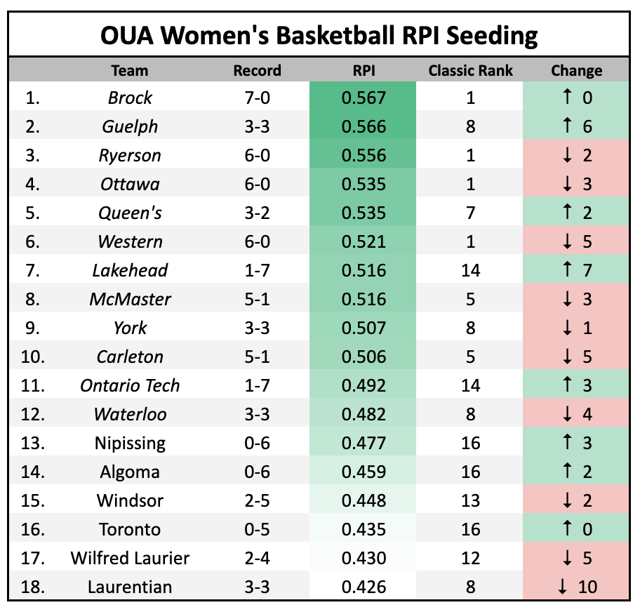 If the OUA were to end their regular season right now and seed their playoff based on RPI, this is how the rankings would look like: