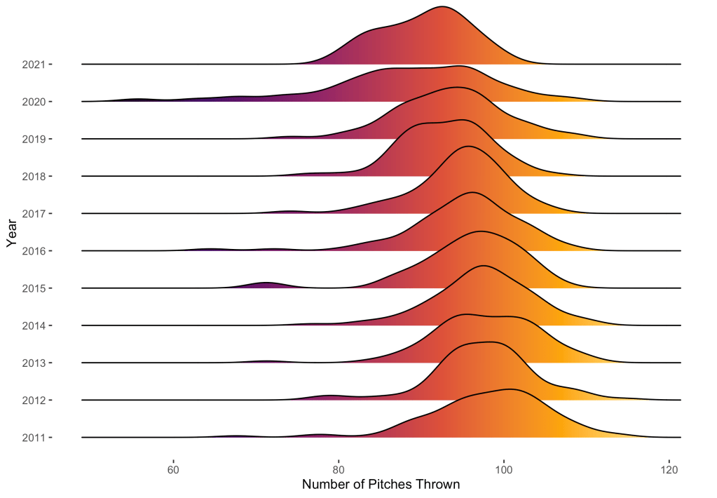 The faster and more aggressively pitchers throw, the more wear and tear they place on their internal structures. There is a commonly held belief that 100 pitches is the point where a pitcher should be pulled because of the increased risk for injury moving forward. While this seemed to be the case in 2011, as the visualization below shows, pitching stints have decreased year after year and in the 2020 and 2021 seasons, were the lowest of the past ten years.
